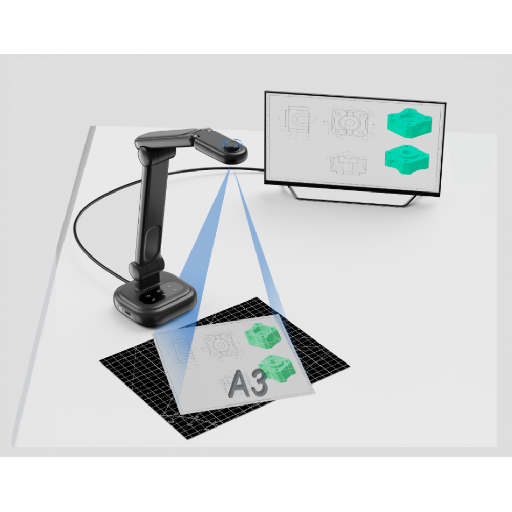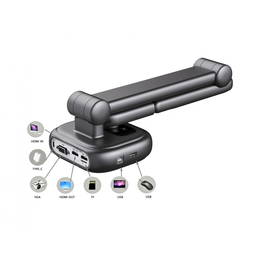 Компактный размер позволяет ее легко переносить и быстро подключать через USB кабель, VGA или HDMI. Документ-камера легко открывается и складывается благодаря гибкому шарниру. Встроенная LED-подсветка обеспечивает чёткое и равномерное освещение даже при слабом внешнем свете.
