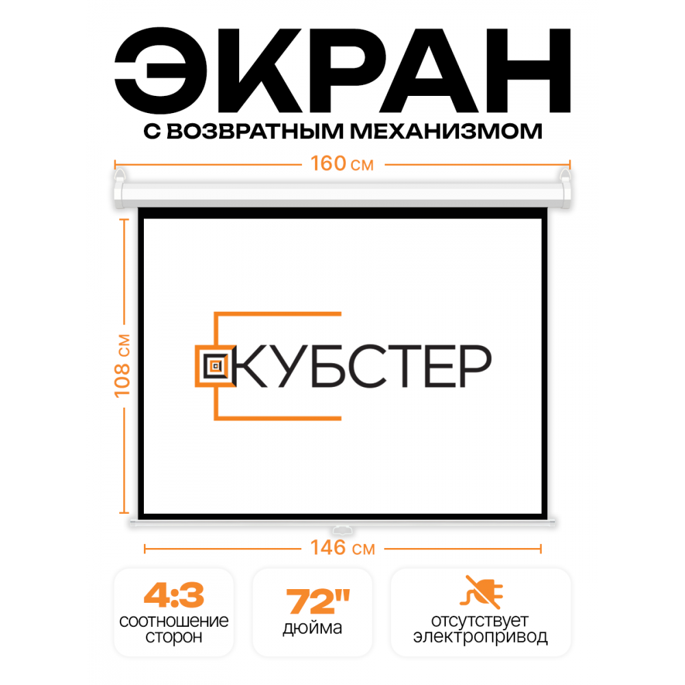 Экран для проектора пружинный Кубстер с возвратным механизмом, диагональ 72 дюйма